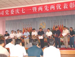 大會在雄壯的國歌聲中開始。公司黨委委員、總經(jīng)理姬洪利同志宣讀了公司黨委《關(guān)于表彰2007年度暨2008年“爭先創(chuàng)優(yōu)”活動先進集體和優(yōu)秀個人的決定》。在工作人員宣讀完受表彰的先進集體和優(yōu)秀個人名單后,大會對在2007年度為企業(yè)發(fā)展和進步做出突出貢獻的7個先進基層黨組織和2個黨風廉政建設(shè)先進黨總支、支部及2008年“爭先創(chuàng)優(yōu)”競賽活動涌現(xiàn)出的5個優(yōu)勝黨總支、支部和10名模范黨員頒發(fā)了獎牌和獎杯。王德華、文興峰、姚金崗三名同志分別代表先進基層黨組織、優(yōu)秀共產(chǎn)黨員、和“爭先創(chuàng)優(yōu)”模范黨員做了表態(tài)發(fā)言。