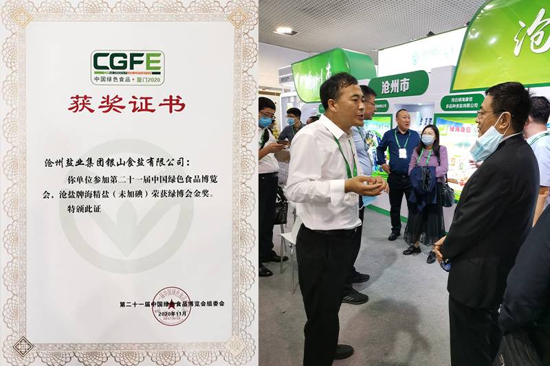 11月4日至11月8日,公司總經理張立莊帶隊赴福建省廈門市參加了第二十一屆中國綠色食品博覽會。"滄鹽"牌未加碘海晶鹽在眾多參展產品中脫穎而出,獲得本屆博覽會金獎。