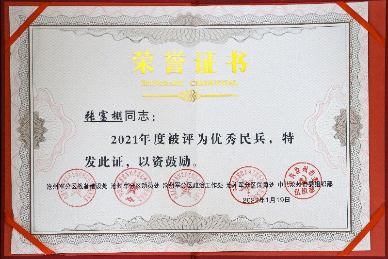 此外,公司武裝部長張富棚還被滄州軍分區授予“2021年度優秀民兵”稱號。