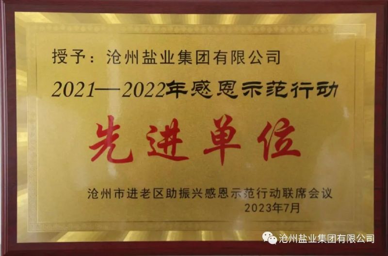 2023年7月,集團(tuán)公司被滄州市進(jìn)老區(qū)助振興感恩示范行動聯(lián)席會議授予“2021—2022年感恩示范行動先進(jìn)單位”榮譽(yù)稱號。