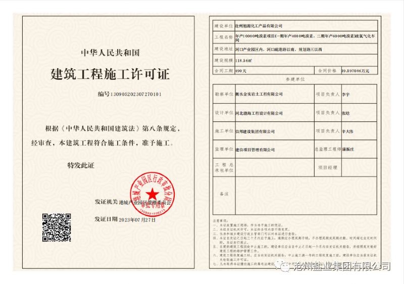 7月27日,滄州旭源化工產(chǎn)品有限公司年產(chǎn)10000噸溴素項(xiàng)目順利取得《建設(shè)工程施工許可證》,標(biāo)志著該項(xiàng)目正式進(jìn)入施工階段,拉開了溴素?cái)U(kuò)能建設(shè)的序幕。