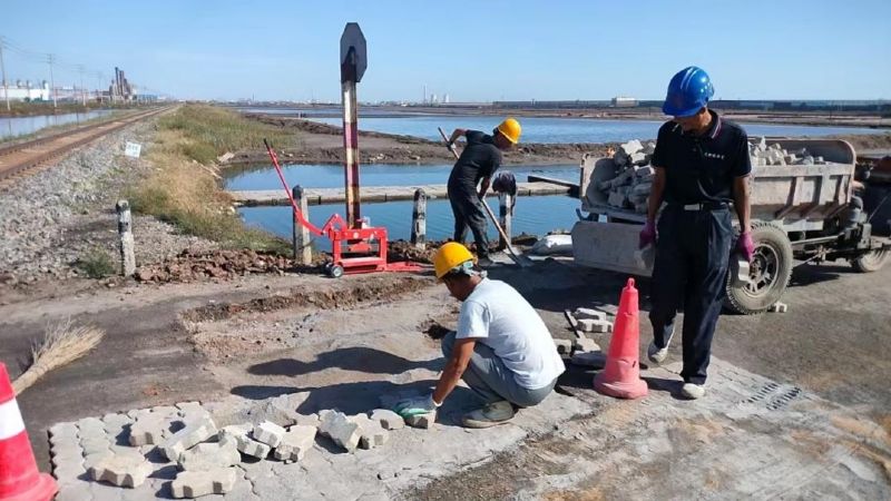 9月29日,建筑工程公司施工科職工早早來到施工現場,提前準備好發電機、水泥、連鎖塊、沙子、石子等工具材料,通過對現場勘查,制定出修補辦法。按照修補方案,職工們開始了道路修補工程。修補施工現場,一派忙碌的景象,職工們有砌磚的、有拌灰的、有灌縫的,電鎬的沖擊聲、發電機的轟鳴聲與職工忙碌的身影交匯在一起,成為一道亮麗的風景線。