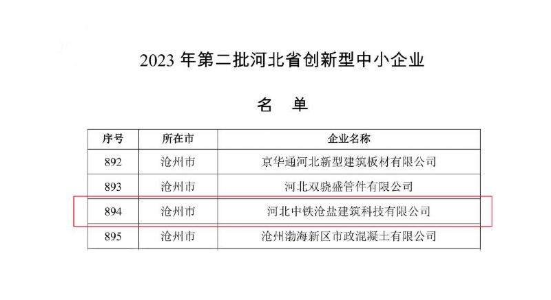近日,河北中鐵滄鹽建筑科技有限公司獲評河北省2023年“創新型中小企業”榮譽稱號。