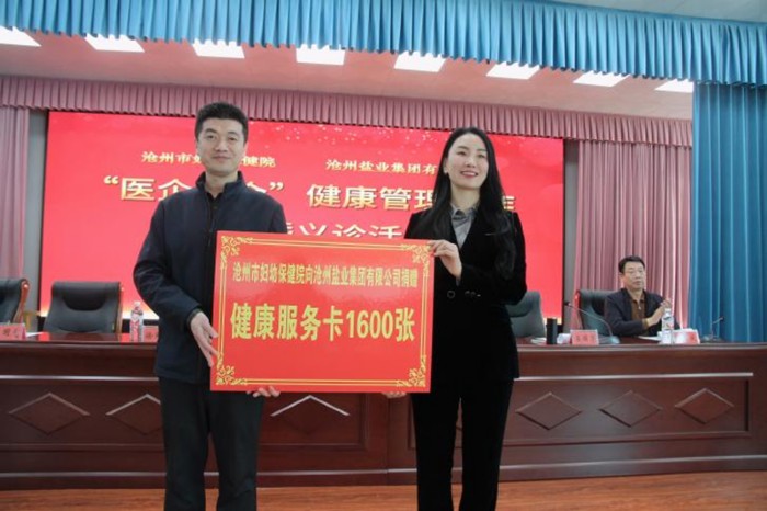 在參會人員的共同見證下,張立莊、徐聞鉑分別代表滄鹽集團、滄州市婦幼保健院簽訂了“醫企融合”健康管理合作意向書。張立莊、狄彬、徐聞鉑、崔國光共同為“醫企融合”健康管理合作單位揭牌。崔國芳代表滄鹽集團現場接受了滄州市婦幼保健院捐贈的1600余張健康服務卡。