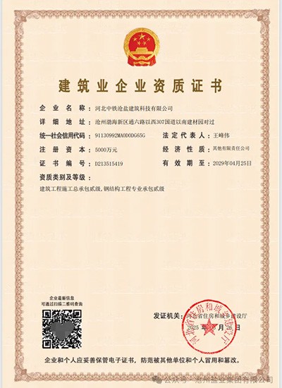 5月26日,河北中鐵滄鹽建筑科技有限公司成功實現了資質證書的升級,資質類別及等級正式提升為建筑工程施工總承包貳級、鋼結構工程專業承包貳級。