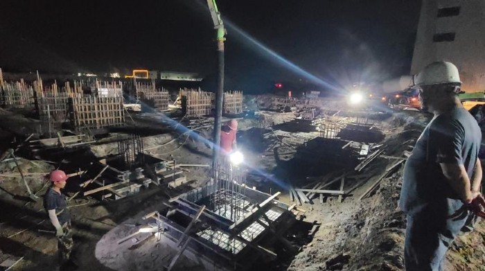 8月3日晚,建筑工程有限公司在鳴岐化工項(xiàng)目的施工現(xiàn)場一片忙碌。為搶抓施工黃金期,避開日間高溫影響,同時趕在大雨來臨前推進(jìn)關(guān)鍵節(jié)點(diǎn),項(xiàng)目部科學(xué)統(tǒng)籌,利用晚間進(jìn)行施工作業(yè),集中澆筑罐區(qū)-罐組及泵棚基礎(chǔ)混凝土,總量達(dá)160立方。